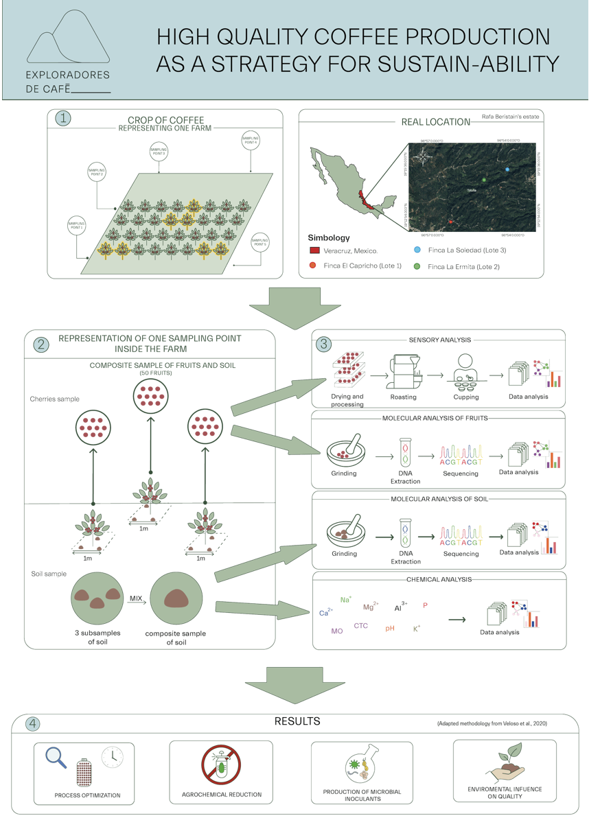 The study focuses on a single coffee farm in Veracruz, Mexico, where multiple sampling points are established across different plots. From each point, coffee cherries and soil samples are collected and combined into representative composite samples.